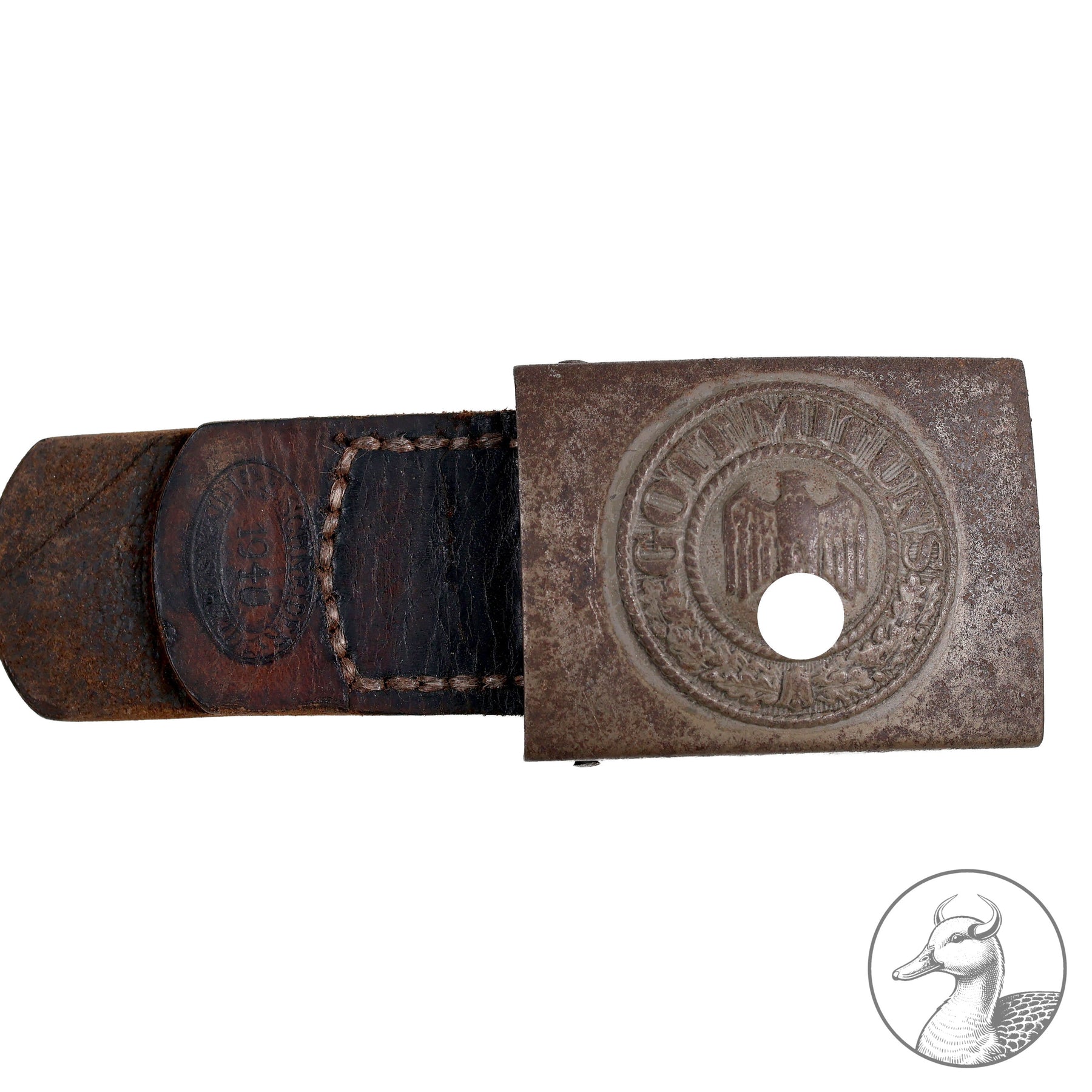 Koppelschloss der Wehrmacht in Eisen für Mannschaften mit vom Hersteller geprägter Lederzunge (E. Schneider - Lüdenscheid) "Gott mit uns"