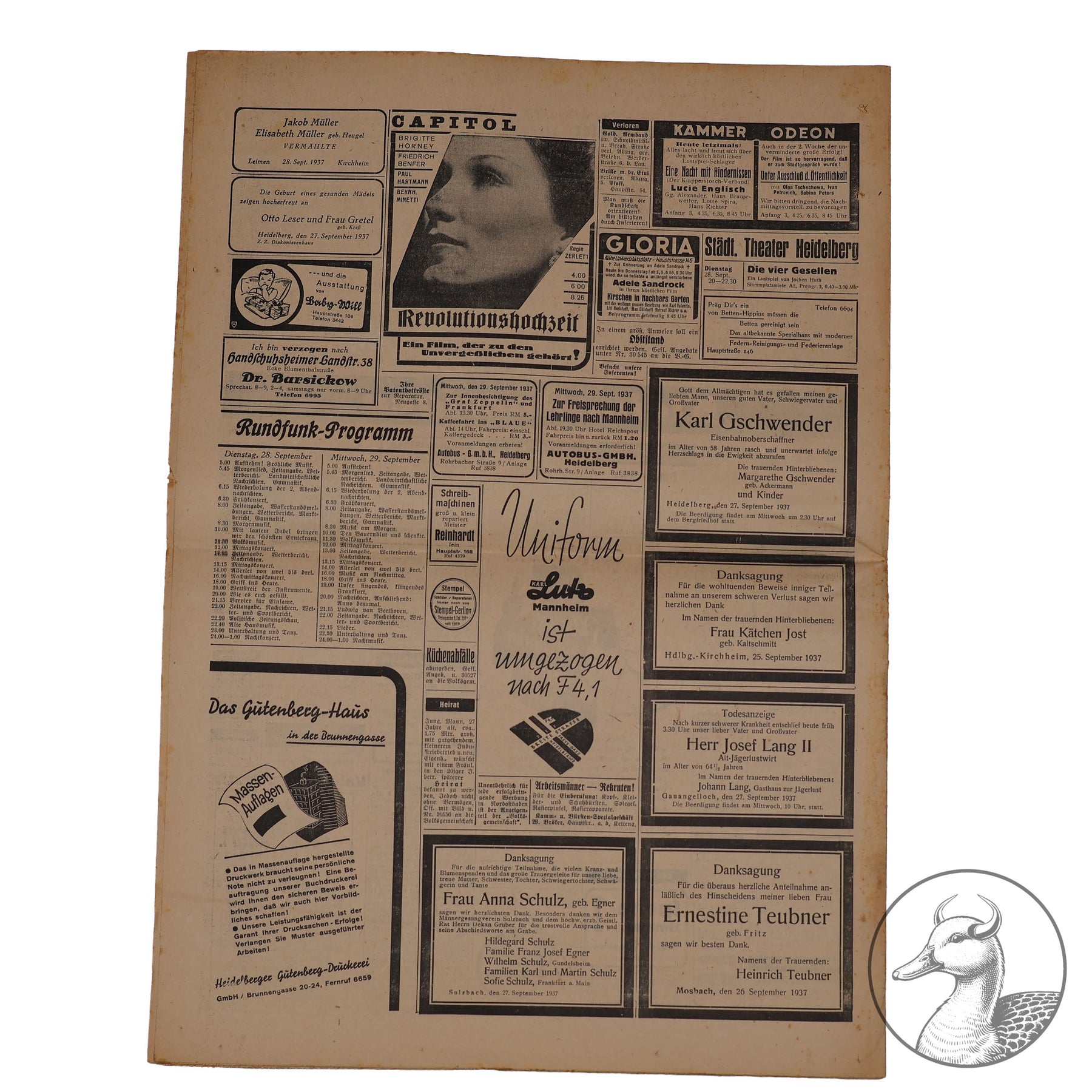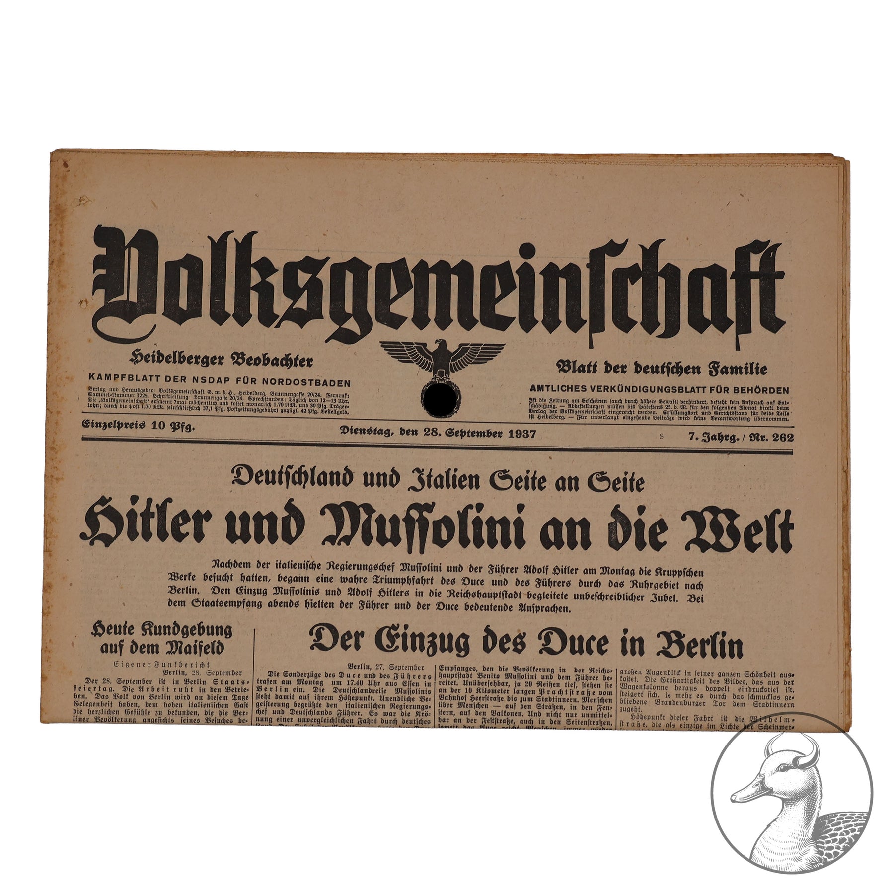 Zeitung Volksgemeinschaft  28.9.1937 Heidelberger Beobachter